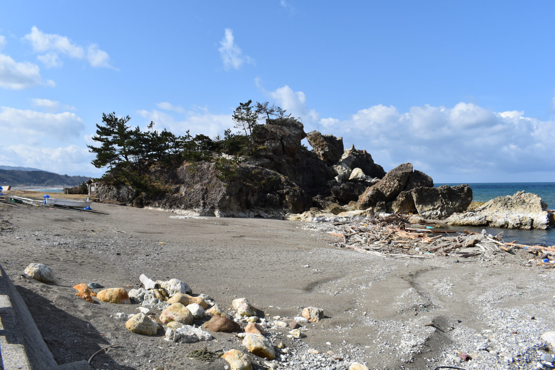 | 説明 | 隆起して崩れた曽々木海岸の窓岩。周辺には大量の流木などがみられる |