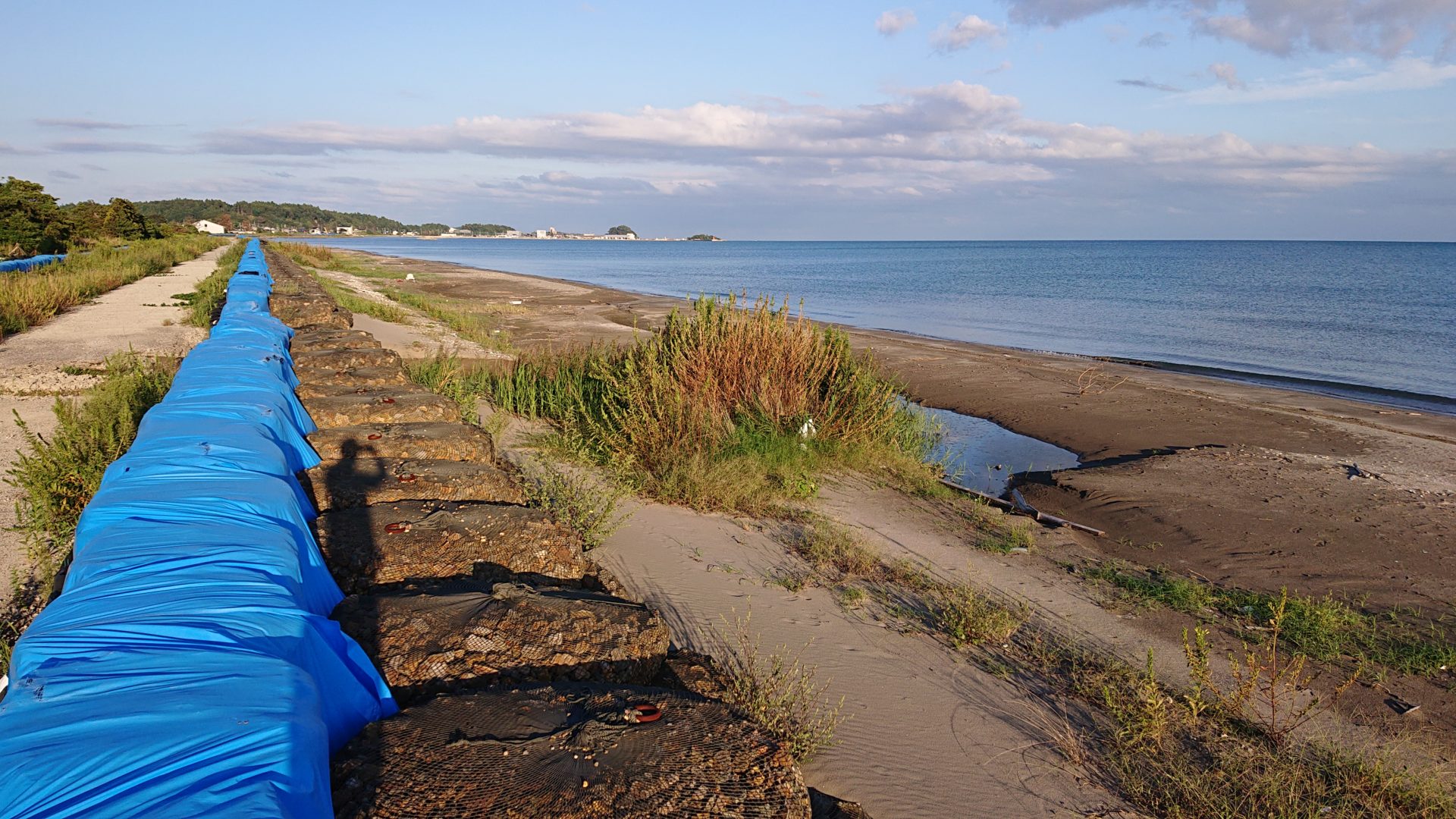 | 説明 | 珠洲市野々江町地先の砂浜に、土のう袋が二列に積まれた状況 |