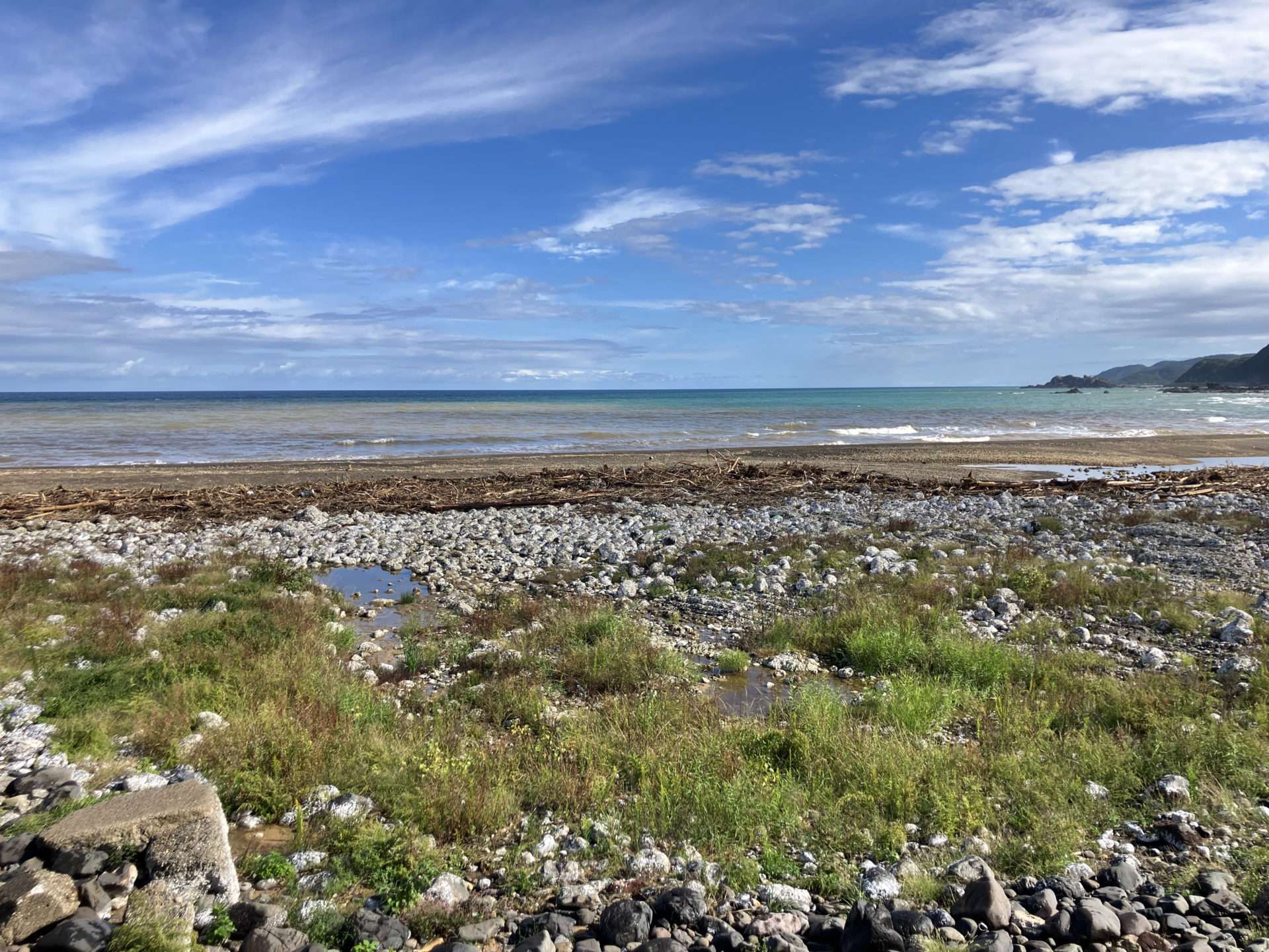 土砂の流入した大谷小中学校前の海と隆起した浜(1)