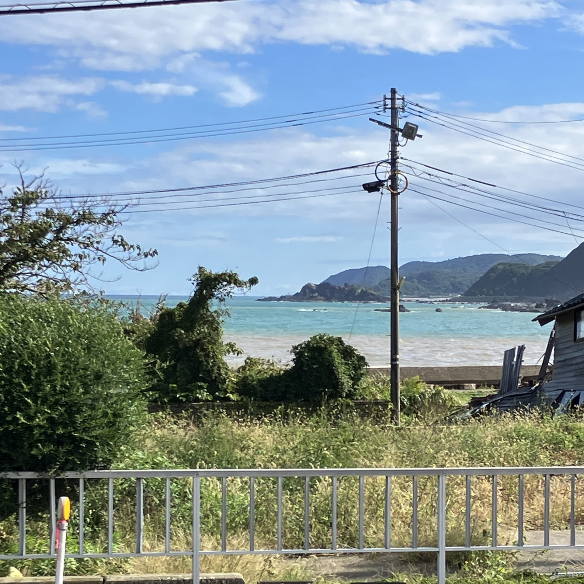| 説明 | 大谷小中学校周辺の道路から北東側の海を臨むと、青く澄んだ外洋の手前に、豪雨で流入した土砂の影響による濁水が見える |