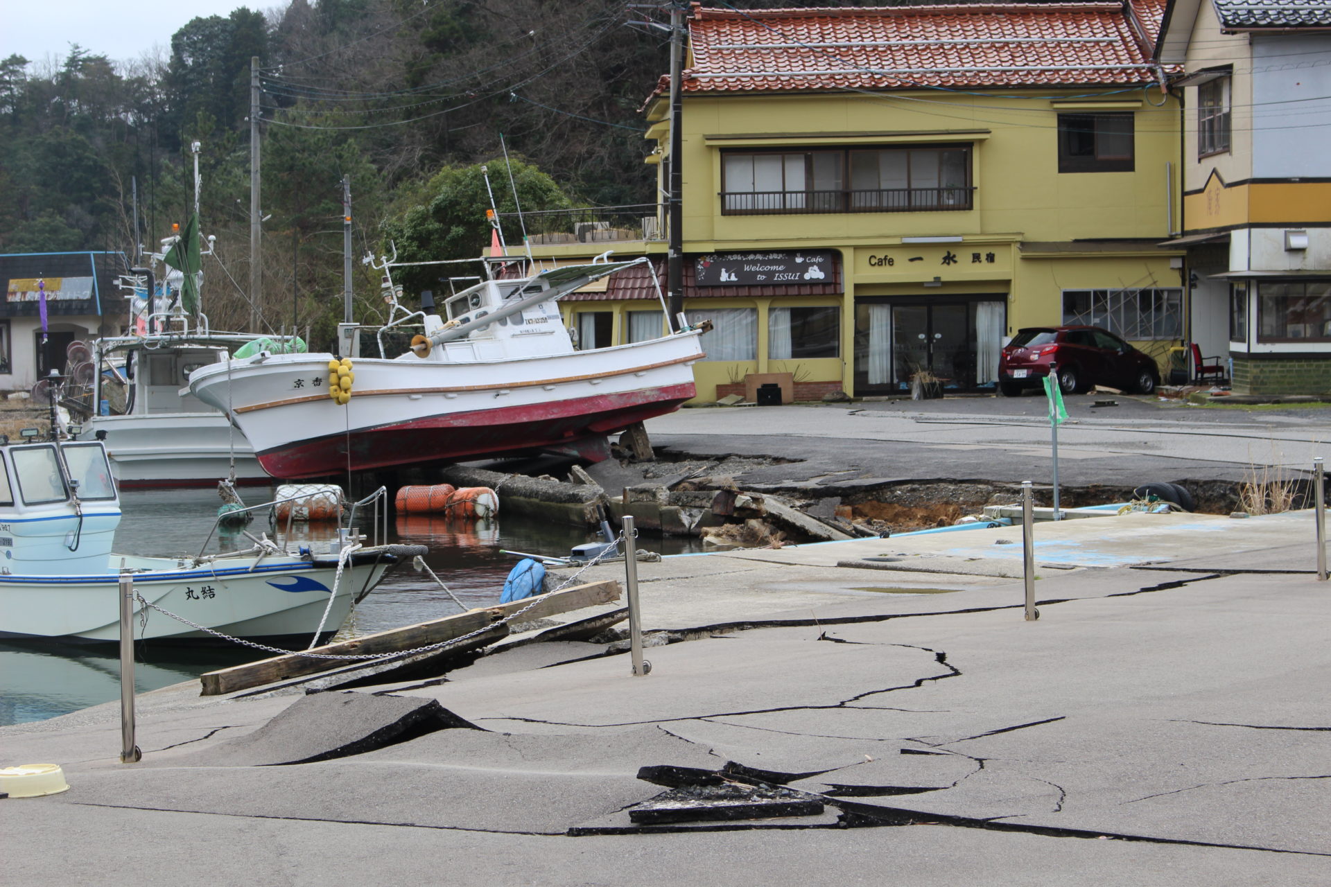 | 説明 | 津波の岸壁越流により、船体が岸壁に打ち上げられ、民宿一水を含む周辺施設や家屋が被害を受けた。また地震により護岸が損壊した。(能登町市之瀬(イカの駅つくモール前)) |